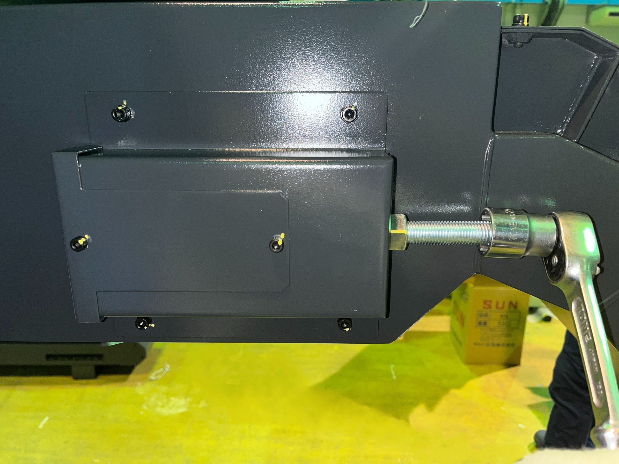 動画マニュアル HOME チップコンベヤ 1.【コンベヤチェーンテンション調整】50タイプフロアーコンベヤ 1.【コンベヤチェーンテンション調整】50タイプフロアーコンベヤ 2025-8-27 更新 コンベヤチェーンのテンション(張り)を調整する作業です。 24mmスパナ(またはモンキーレンチ)、ラチェットレンチ(ソケット24mm)、六角レンチ、直尺 PDFダウンロード 目次 STEP 1 左右のテンションボルトのロックナットを緩める STEP 2 左右のテンションボルトを均等に少しずつ締め込む STEP 3 締め込んだテンションボルトを左右均等に緩める STEP 4 駆動軸からフレーム端までの⻑さを左右均等にする STEP 5 テンションボルトのロックナットを締め込む 作業人数1人 所要時間20分 50タイプ、80タイプの区別はチェーン銘板を参照してください。チェーン銘板は排出部付近に取付けてあります。 50タイプ:2052 80タイプ:2082 作業を始める前に必ず、MC、コンベヤの電源を切り、コンベヤが完全停止していることを確認してください。重大な事故につながる可能性があります。 作業に適した格好でおこなってください。また、保護帽・保護眼鏡・保護手袋・安全靴を必ず着用してください。 不明な点は、弊社までお問い合わせください。(TEL:076-274-1188) 作業内容 注意事項 STEP1 作業内容 左右のテンションボルトのロックナットを緩める コンベヤ左右のテンションボルトのロックナットを緩めます。 24mmスパナまたはモンキーレンチ 注意事項 電源を切る前にコンベヤ運転をし、なるべく内部に溜まった切粉を排出してから実施してください。 異常と思われる場合は、弊社サービスまでご相談ください。 STEP2 作業内容 左右のテンションボルトを均等に少しずつ締め込む 左右のテンションボルトを均等に少しずつ締め込み、⼀旦チェーンが張ってボルトが固くなるまで締めます。 チェーンの遊びが無くなったところで⽌めてください。 ラチェットレンチ(ソケット24mm) 注意事項 無理に締めすぎないようにしてください。破損の原因となります。 あまり⻑いラチェットレンチを使⽤して締め込むと破損する場合があります。 STEP3 作業内容 締め込んだテンションボルトを左右均等に緩める 締め込んだテンションボルトを左右均等に緩めます。 左右のテンションボルトを180度ずつ緩めることを交互に⾏い、それを約2~3回程度⾏います。 写真の様に下からチェーンを押えて3~5mm程度の遊びになるように調整します。 ラチェットレンチ(ソケット24mm) 注意事項 STEP4 作業内容 駆動軸からフレーム端までの⻑さを左右均等にする 遊びの調整が出来たら、左右のテンションを合わせます。 ボルトの締め具合を調整して、駆動軸からフレーム端までの⻑さを左右同じに合わせます。 ラチェットレンチ(ソケット24mm)、直尺 注意事項 直尺を駆動軸に当て、フレームの端まで⽔平に測り左右で同じ⻑さになるようにします。 STEP5 作業内容 テンションボルトのロックナットを締め込む 左右の調整が出来たらテンションボルトのロックナットを締め込んで固定します。 24mmスパナまたはモンキーレンチ 注意事項 PDFダウンロード インデックスに戻る