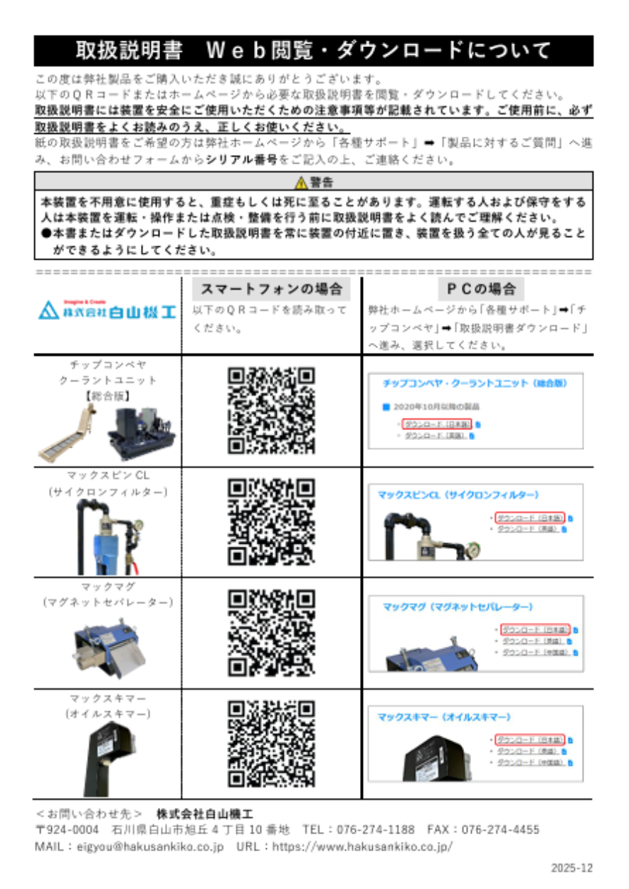 弊社では環境負荷低減の観点から、チップコンベヤに付属しておりました紙媒体の取扱説明書について、WEB閲覧・ダウンロード形式への切り替えを段階的に実施しております。